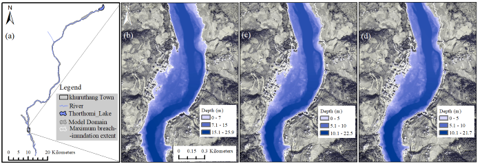 A comparison of inundation depth and extent for three breach scenarios at Khuruthang town within the study area